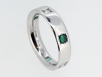 《状態》ダイヤモンドとエメラルドが交互にセッティングされた指輪で、エメラルド2石が外れてしまった。《加工内容》エメラルド2石を石合わせして石留めする加工修理に加え、地金の色(薄いゴールド色)が出始めている為ロジウムメッキをかけ直した。