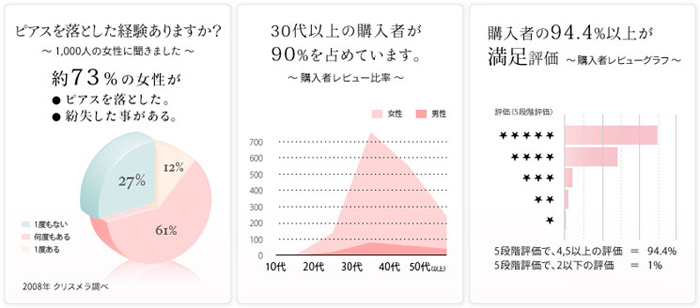 | 【商品】 お出掛け先でピアスキャッチを落としてしまう・・・。そんなお悩みを解決する次世代構造のピアスキャッチ!イエロー、ホワイト、ピンクの3色♪医療用メスなどに使用される「サージカルステンレス」で出来ているので、アレルギーにも強い優れモノ。ほぼ全ての幅のピアスポストに対応しており、ひとつあれば安心のピアスキャッチです。